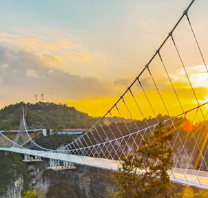 早餐后乘车赴全球瞩目的世界最长、最高的【世界第一玻璃桥--云天渡玻璃桥】桥高约 400 多米,长约 370 米,宽 6 米,全部采用 99 块透明玻璃铺设而成,感受刺激,陶醉神奇,见证奇迹;全长 400 米,在这里,你可欣赏到峡谷全景,若对着谷底喊上一嗓子,回音袅袅参观地下山河,然后参观土家民族精粹和传统手工艺术展览中心—【印